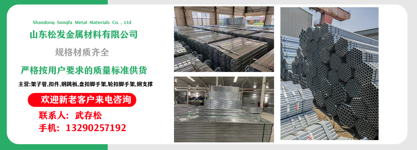 山東松發(fā)金屬材料有限公司主營架子管,扣件,鋼跳板,盤扣腳手架,輪扣腳手架,鋼支撐生產(chǎn)廠家。本廠專業(yè)生產(chǎn)銷售。 建筑用架子管、 主要用于房建,橋梁,鐵路,公路,地鐵,水庫,隧道,支撐。 架子管,扣件,鋼跳板,盤扣腳手架,輪扣腳手架,鋼支撐的優(yōu)越性及應(yīng)用“ ”產(chǎn)品因具有結(jié)構(gòu)簡單合理、設(shè)計(jì)巧妙、使用方便、安全、快捷、易于運(yùn)輸、儲存、維護(hù)簡單等特點(diǎn)。 公司一貫堅(jiān)持“質(zhì)量,用戶至上,優(yōu)質(zhì)服務(wù),信守合同”的宗旨,憑借著高質(zhì)量的產(chǎn)品,良好的信譽(yù),優(yōu)質(zhì)的服務(wù),產(chǎn)品暢銷全球。歡迎廣大客戶來電洽談,共同發(fā)展,共創(chuàng)輝煌! 山東松發(fā)金屬材料有限公司秉承誠信服務(wù)、恪守信譽(yù)的宗旨,在同等的質(zhì)量下,保證以最低的價(jià)格,最完善的服務(wù),最高的信譽(yù)來答謝各界朋友的支持和厚愛,歡迎您的來電、咨詢,我們將竭誠為您服務(wù)!...